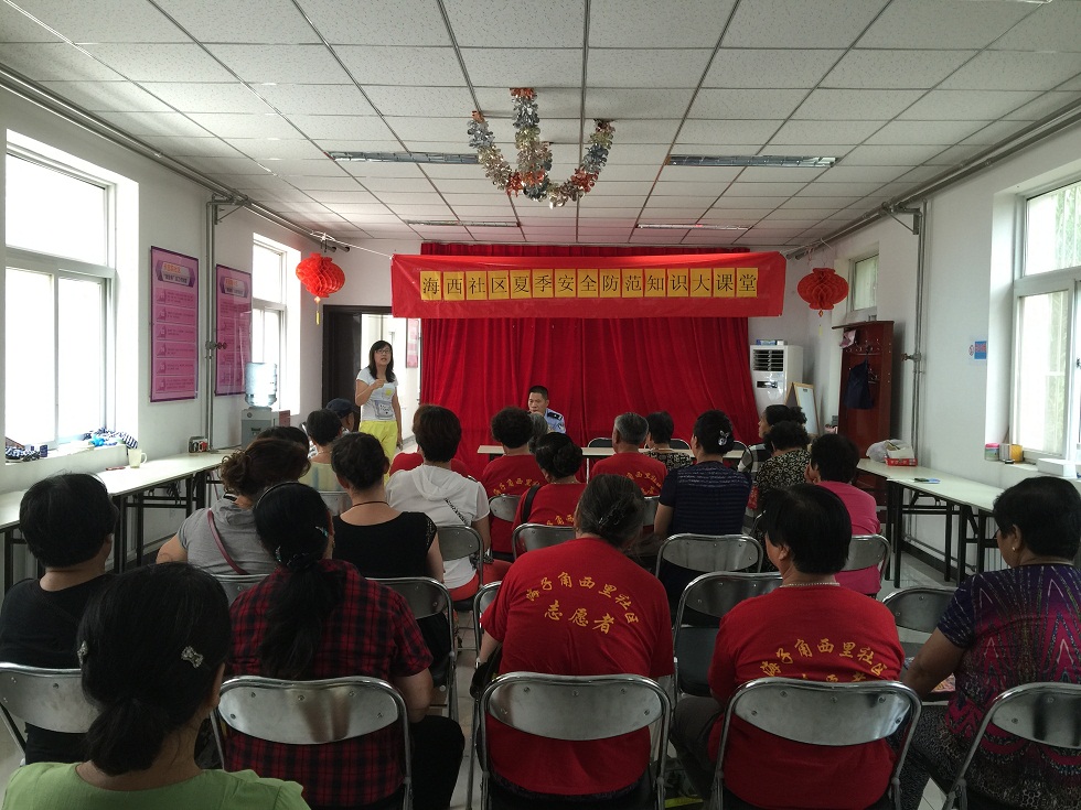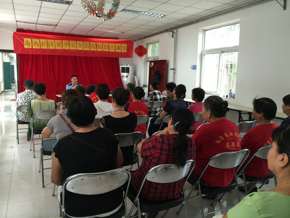 | 为加强居民安全防范意识,近日,在天宫院街道海子角西里社区开展了夏季安全防范知识大课堂活动。街道综治干部、社区工作人员、红袖标巡逻队、楼门长长及部分居民近40余人参加了此次活动。