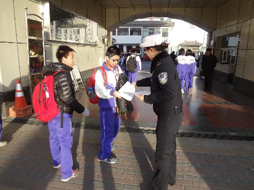 活动中,安监民警利用下午放学时段,首先向广大学生们发放了《致学生的一封信》,告诫学生们乘车时不把肢体伸出窗外;上、下学步行时,要走人行横道或者靠右边行走,注意观察路面交通情况,不要闯红灯、乱穿乱行、互相追逐打闹,更不要与机动车抢道争先等日常出行常识。以免发生危险,造成人身伤害。随后,对校园周边等候学生的家长进行交通安全宣传。边发放带有交通宣传字样的《致市民的一封信》、《温馨提示》的同时,向家长们讲解机动车乱停、乱放、占用盲道等交通违法行为的危害性,它不仅扰乱了交通秩序,加剧了交通拥堵,交通事故的潜在危害性,也给首都形象造成了极大的损害。所以请家长把车辆停放到远离校区的安全地带,避免发生危害学生安全的交通事故的同时还师生一个安全和谐的交通环境。